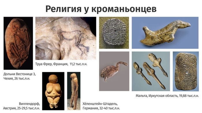 А это уже говорит о том, что появились представления о загробной жизни, что человек как бы вроде бы умер, но вроде бы и не совсем. Появляется массовое искусство, тоже отражающее какие-то религиозные представления. Скорее всего, не все такие, и для некоторых у нас строгих доказательств нет. Ну, например, женские статуэтки можно интерпретировать, что это женщины-богини, прародительницы, опять же символ плодородия и все такое. Но может быть и нет, а может быть это игрушки — толком неизвестно. Но когда у нас в Хёленштейн-Штаделе, например, есть фигурка вроде бы человека, но со львиной головой, это уже как-то подозрительно.