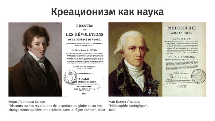Тогда параллельно был Жан Батист Ламарк, который считал тоже, что все создано, естественно, Богом, все по Библии, и дальше ничего не менялось почти. Ну немножечко изменения были, когда пресловутый жираф вытягивал шейку и что-то там такое по этому поводу менялось. Но исходную версию про библейское сотворение эти ученые не трогали.