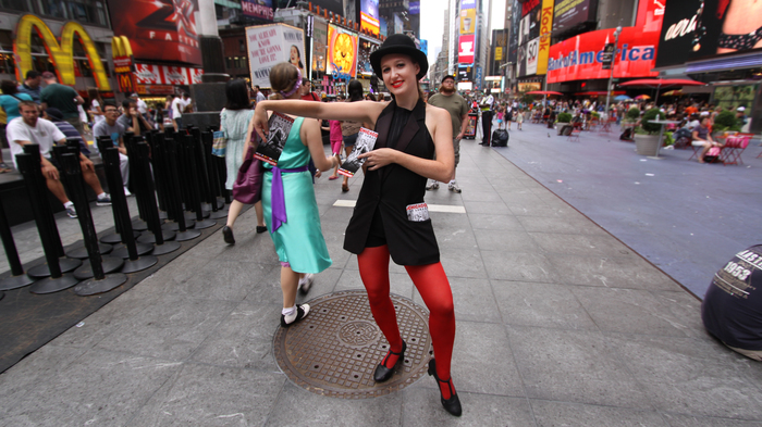 В этом месте много концертных залов где идут мюзиклы, поэтому рекламные листовки раздают на каждом углу.
