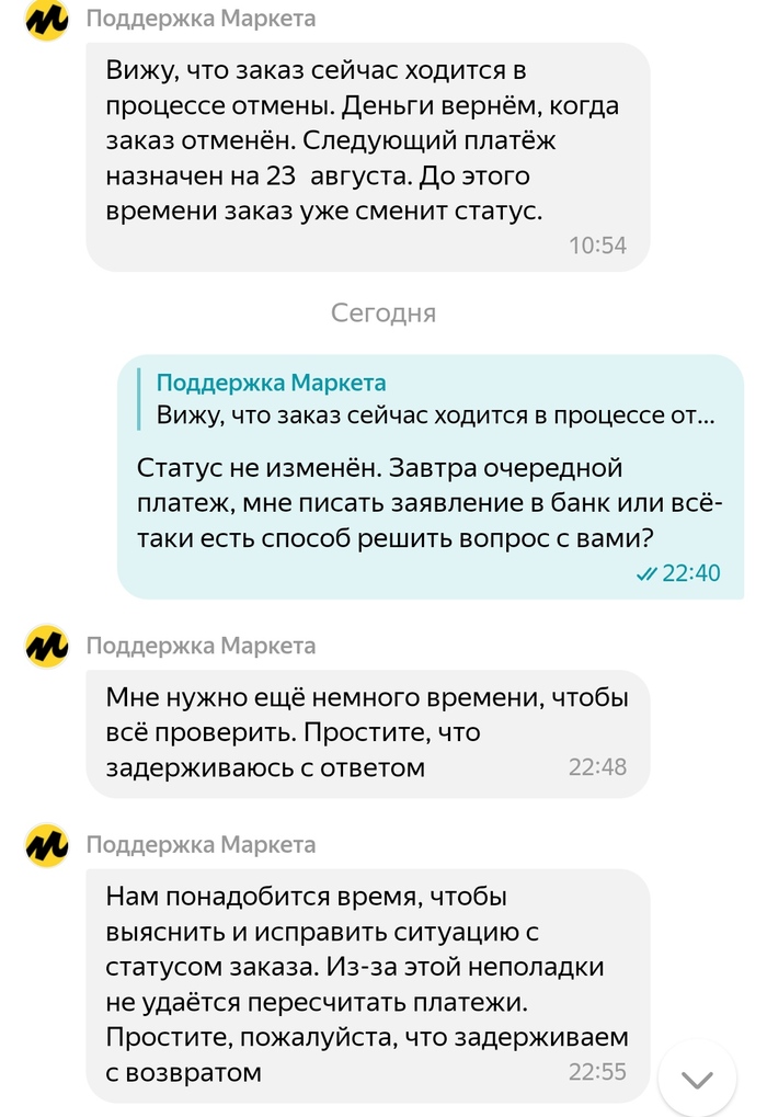 Как же так, идём в поддержку пишем им. Они обещают оперативно разобраться до момента очередного платежа, который запланирован на 23 августа. Текут дни, до 23 августа остаётся пару часов, а вопрос так и не решён.