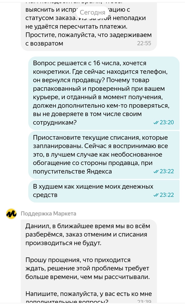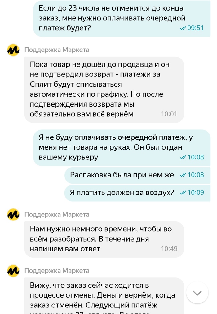 Когда становится понятно, что что-то пошло не так, я связываюсь с поддержкой Яндекса, описываю ситуацию и мне представляется вернуть телефон с курьером обратно, так как он ещё рядом. Статус заказа меняется на "ожидание отмены", телефон уезжает Яндексу, а я начинаю ждать возврат денег, за оплаченную первую часть.
