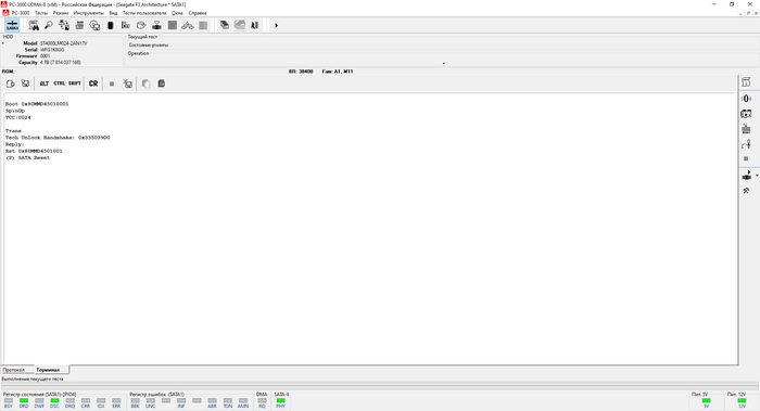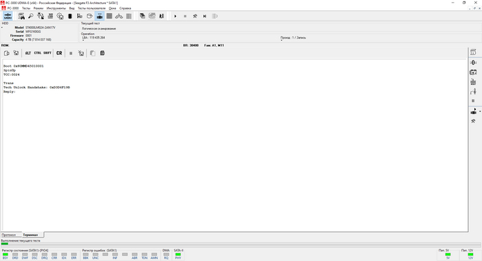 Далее диск дает доступ по терминалу и позволяет сохранить данные служебной области, так как данные нам не нужны, проверив модули выполняем очистку Alt list, сброс смарт, инициализацию медиакеш, убираем вредные галки в редактировании паспортных данных. Диск начал выходить в готовность штатным образом по АТА. В некоторых таких случаях приходится ремонтировать битые, сбойные модули и записывать их обратно, или же их обходить, чтобы получить доступ к пользовательской зоне с данными.