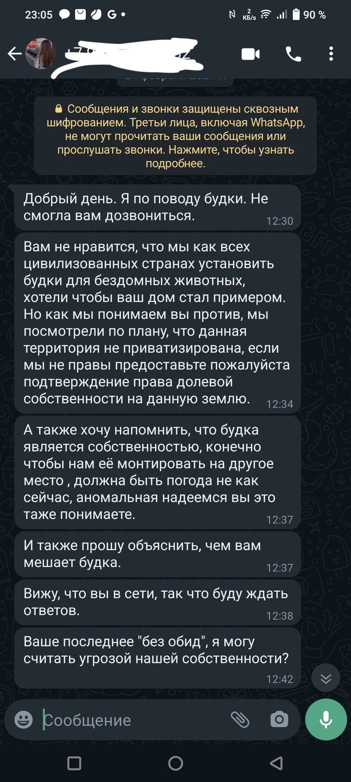 Поставили нам недавно собачью будку рядом с многоквартирным домом. Не спросили даже. Якобы там должны жить бездомные собаки. На обратной стороне телефон хозяев будки, я им написал. Переписку с активистами привожу ниже
