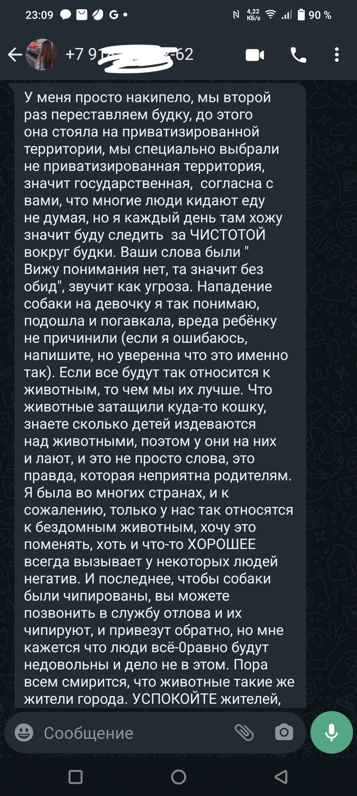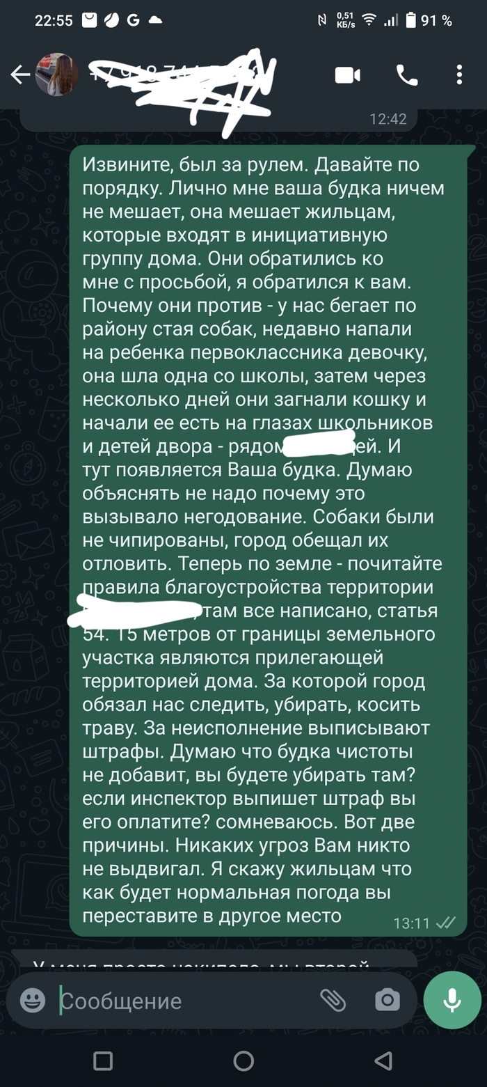 Не буду выкладывать всю переписку, у девушки явно сдвиг на своей теме. После звонка в администрацию будки исчезли. Вот что за люди, хотите что-то сделать, посоветуйтесь, если попросили вежливо переставить, зачем выставлять рога. Хотите ухаживать за животными - стройте приюты в конце концов. Но ставить будки в которых бродячие собаки не будут жить, это же бред. Тогда нужно бродячую собаку посадить на цепь у этой будки. Или это насилие над животными? Я думаю сейчас на меня накинуться все зоозащитники, но я как ответственный за территорию, слежу за порядком на ней. И да, оштрафовать за мусор могут на раз-два до 15 тыс.руб