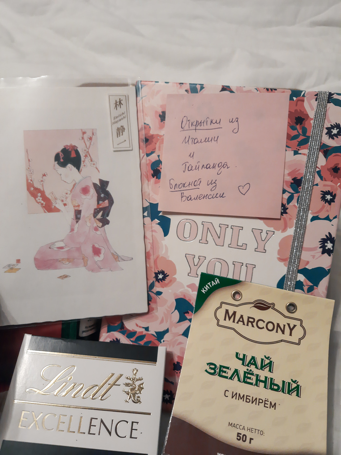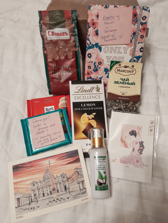 Здесь у нас шоколадки, кокосовое масло для тела, смесь для выпечки печенья, листовой чай, открытки из разных стран и блокнот. Состав посылки прямо таки уговаривает включить фильм, посидеть поесть в тепле и уюте, чем я собственно с радостью занялась!