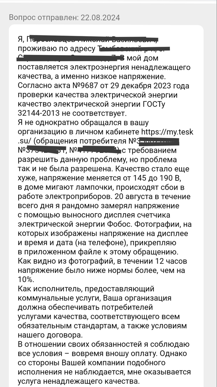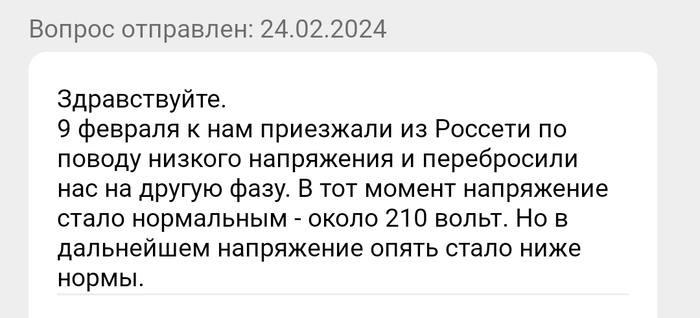 3) Энергосбытовая компания делает заявку в Россети (поставщик). В феврале 2024 г. приезжают из Россетей, перебрасывают на другую фазу. Сначала вроде стало нормальное напряжение, но это было днём, а вечером опять снизилось.