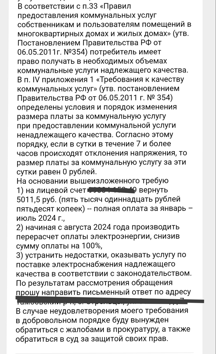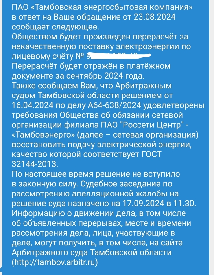 6) Энергосбытовая компания подает на Россети в суд. Мы - третье лицо. Суд удовлетворил требования энергосбытовой компании: обеспечить нас качественной электроэнергией. Потом апелляция (безрезультатной)