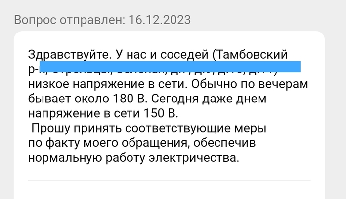 Место действия - пригород города Тамбова. Уже много лет у нас в сети низкое напряжение. Последние несколько лет после 5 вечера было 150-160 вольт. Лампочки моргают, некоторые даже не горят, холодильник недовольно рычит, и вообще страшно за технику. Утром, днём получше - около 180 В.