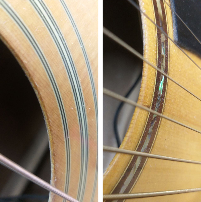 Слева фанера, под слоем елового шпона - аморфная светлая масса. Иногда видны чередующиеся слои, темные и светлые,, но не в этом случае. Справа массив резонансной ели, видны волокна, проходящие через всю толщину деки.