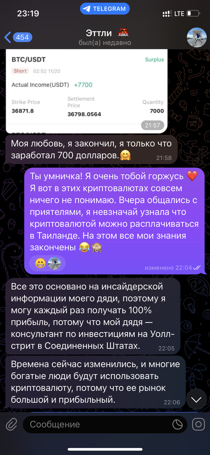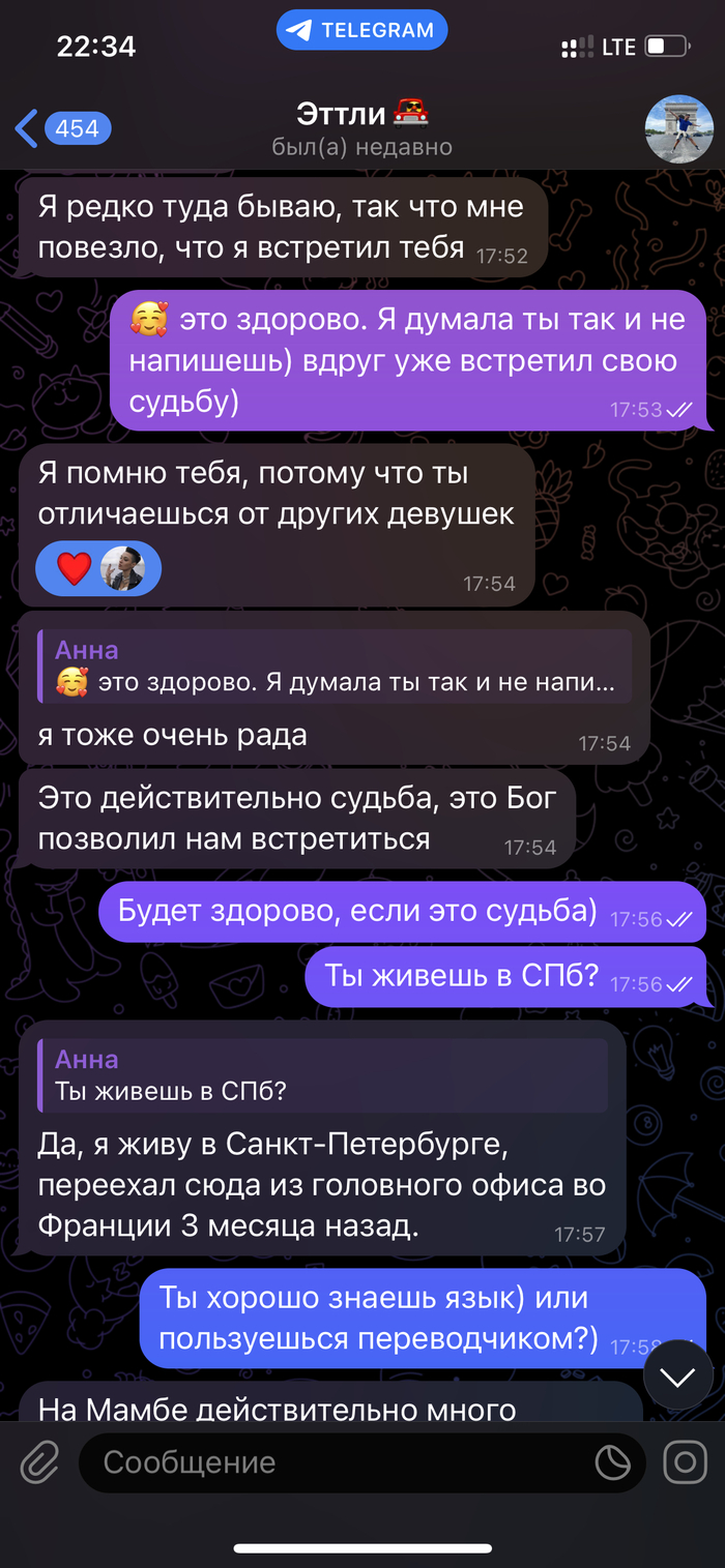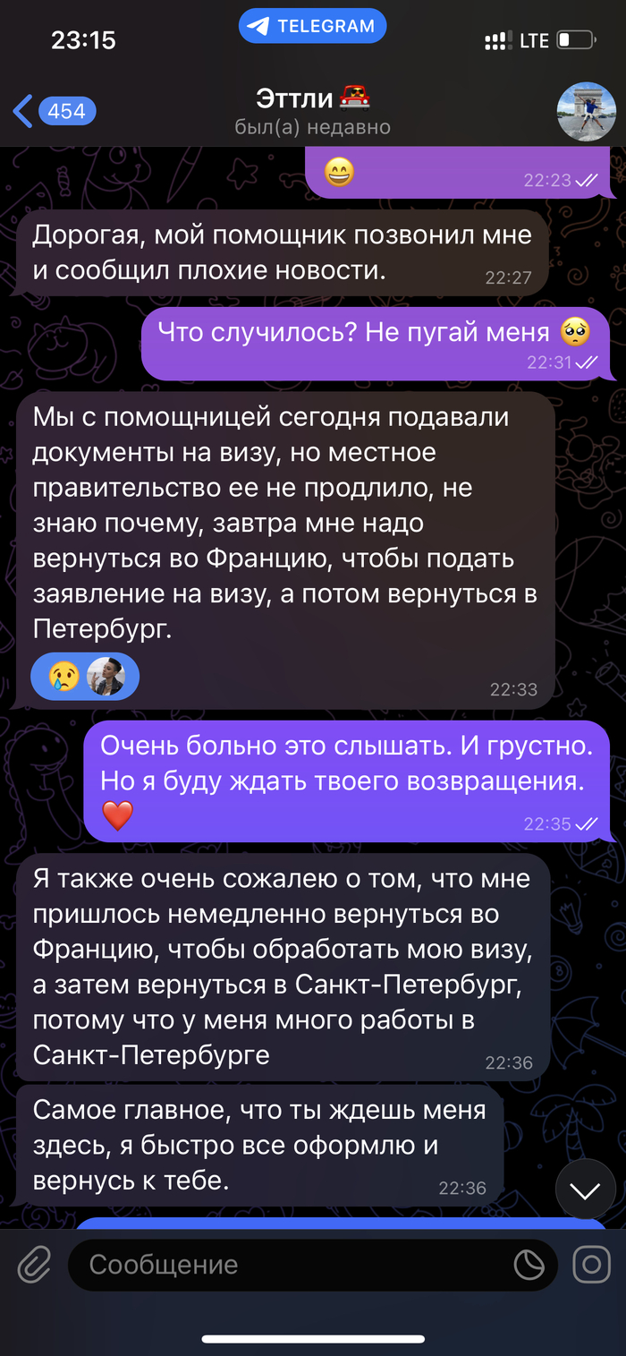 На следующий день получаю видео с самолета. Фото из аэропорта. Из дома. Прям полный фотоотчёт. И конечно клятвы что он вернётся уже очень скоро. Продолжаем переписку в стиле дешевого бульварного романа. И вот когда за вторую неделю он, в общей сложности, упомянул своего нереального дядю еще раз 5, мой звонящий колокол просто оглушил. В последние дни общения он скидывал мне какие-то квитанции транзакций. Я полезла в гугл. Ага. Схема есть. И достаточно популярная. Что ж… ждём как он подведет меня к этому 🤔 Бульварный французский роман в самом разгаре при том! Меня одобрили все его друзья и семья. Летом свадьба 😁