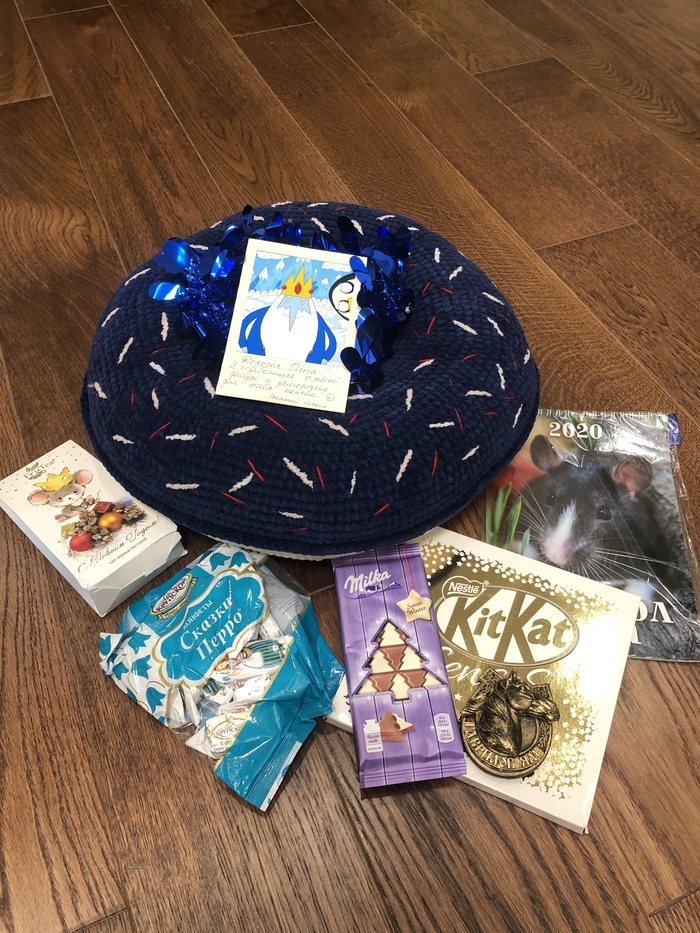 Снежный король из Гаврилов Ям (не знаю, склоняется или нет :)) приготовил для меня супер подарок) Шоколадки, прям как я люблю! Пончик - восторг, юзаю его уже вовсю (для меня этот пончик спасение, потому что люблю делать пучок или крабиком закалывать волосы, и на обычной подушке лежать очень неудобно, а здесь прям вах!). И остальные подарочки супер! Спасибо большое! И отдельное спасибо организаторам, в следующем году буду участвовать ещё раз, мне понравилось! Всем мяу 😸