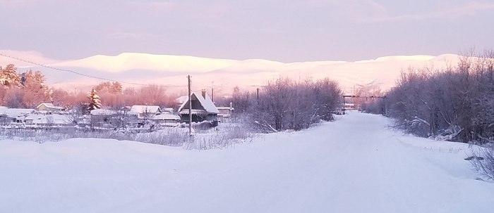Зато погуляли по приозёрной деревне и посмотрели на замечательные виды заснеженных гор, освещённых вечерним (или утренним? Это был час дня, время, когда восход в Апатитах плавно переходит в закат) солнцем.
