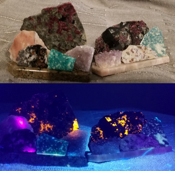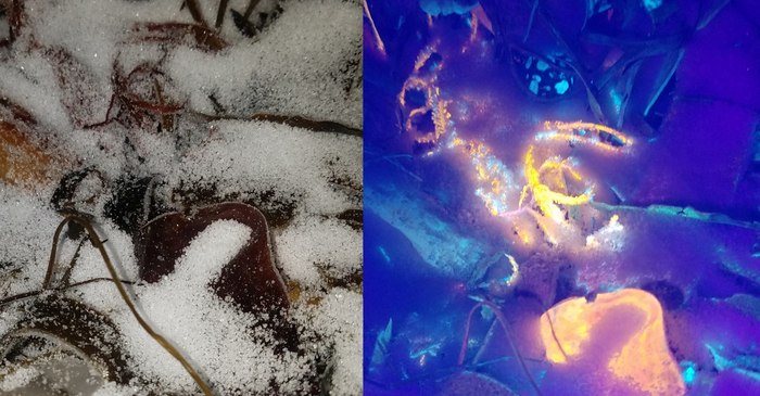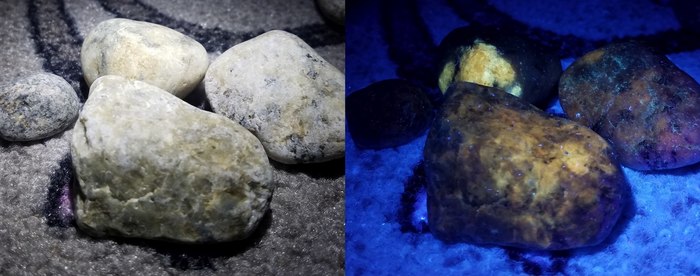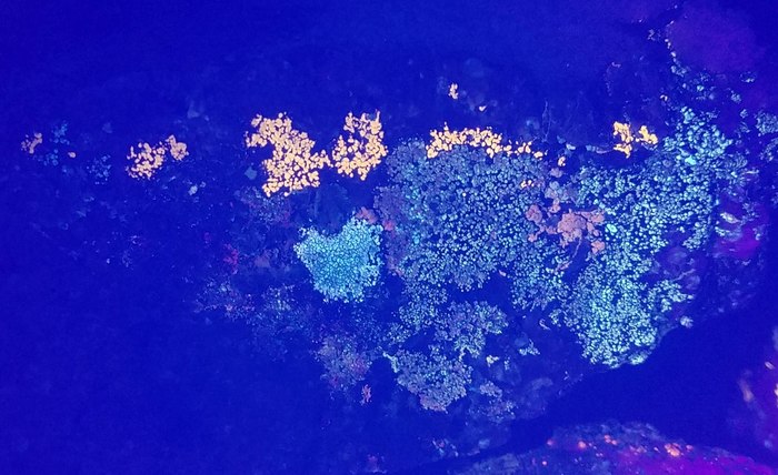 Испытывал УФ фонарь. Лучше всего он находит мусор, :-). Но на камнях растут накипные лишайники, роскошно флюоресцирующие белым, розовым и жёлтым, Водоросли ярко-красные с белыми игольчатыми каёмками, а среди камней попадаются пятна содалита.