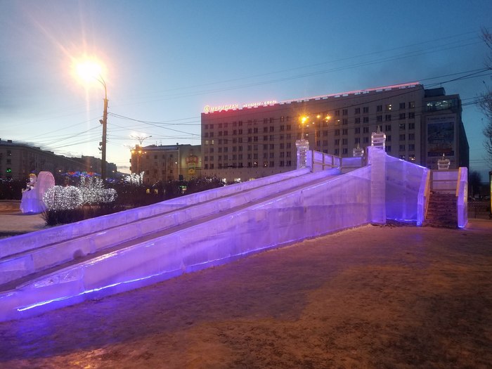 Проходили мимо ледяной горки! На самом деле, она деревянная, наживую собранная из бруса - но обложена толстыми стенками из льда. А в лёд впаяны светодиодные ленты, проплавившие своим теплом ходы сантиметра два толщиной.