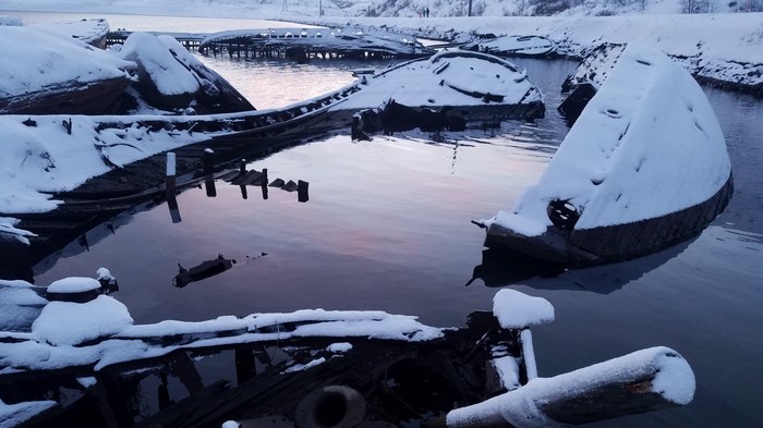 На обратном пути зашли на кладбище кораблей - у берега лежат несколько ржавых железных скелетов лодок, обшитых гнилыми досками.