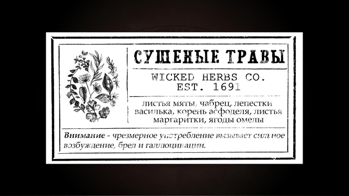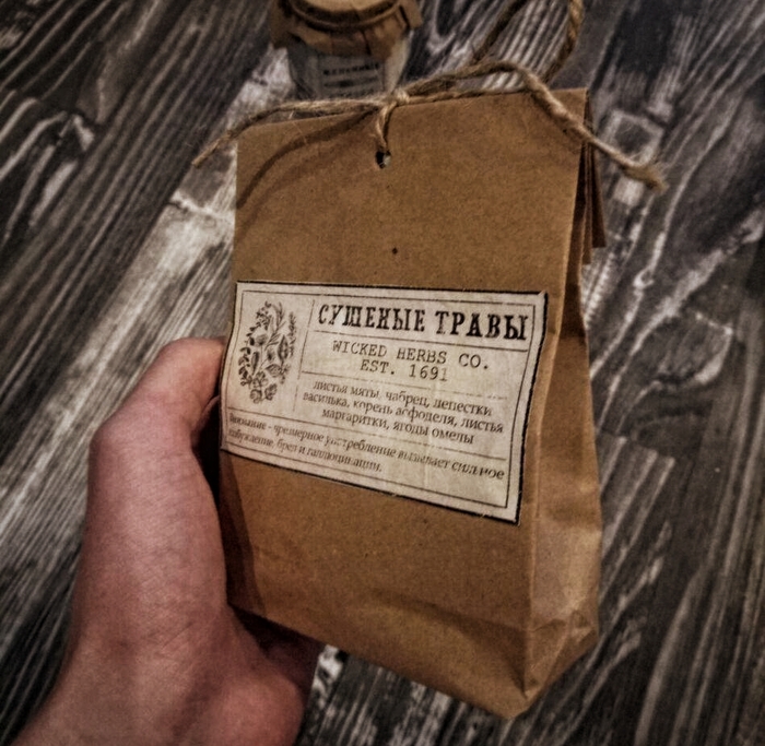 Чай. Подруга очень любит чай (травяные отвары???). Нехитрым путём, я узнал, какие ингредиенты ей нравятся и насобирал в своих запасах нужные мне травы. Из крафт-бумаги сделал подобие пакета и в фотошопе сделал этикетку.