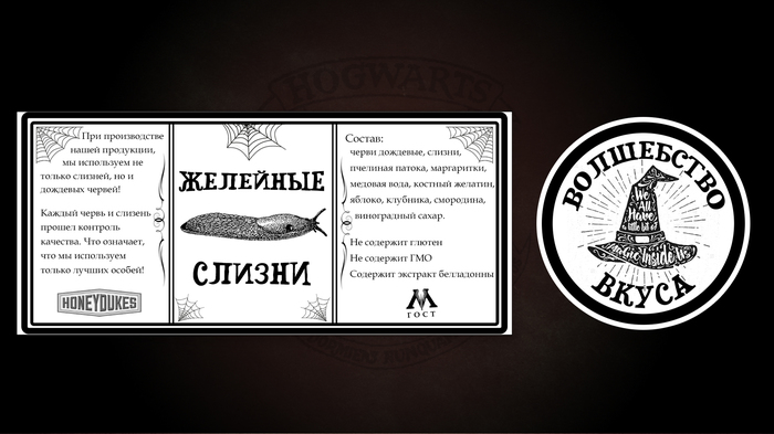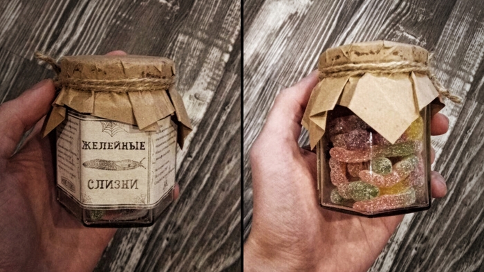 Мармеладные слизни черви в банке. Посмотрев как выглядят оригинальные мармеладные слизни - я решил, что лучше уж купить наших суровых желейных червей). Была куплена баночка, набита кислыми мармеладными червями и так же сделана этикетка на банку и под крышку, в фотошопе.