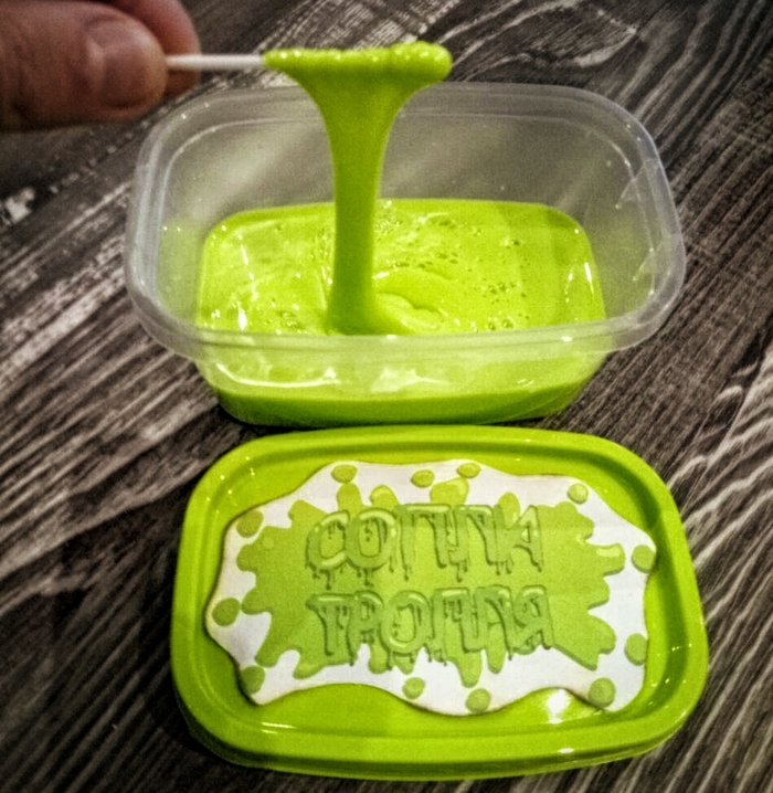 Банка с соплями. Возможно кто-то из вас заметил этот странный пункт в списке выше и он не давал ему покоя) Так вот, забавы ради, я решил воспользоваться своими знаниями в алхимии и создать зелёного антистресс-лизуна. Назвав всё это дело "соплями тролля". Этикетку рисовал и иллюстраторе