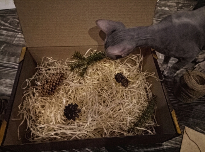 Ну и наконец - запихиваем всё наше добро в чемодан! Внутрь положил наполнитель который имитирует то ли деревянную стружку, то ли сено. Добавил немного ёлочек и разных шишек. Кот не входит в подарок, если что)