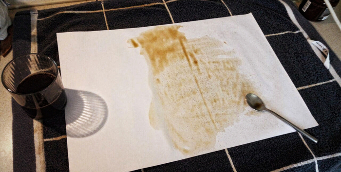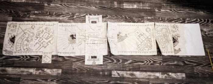 Пытался сделать сам, даже что-то начало получатся. Но как говорил ранее - времени было очень мало, так что пришлось искать какие-то шаблоны. Большое спасибо и низкий поклон /@once13one, за шаблон карты! Карта в отличном качестве поместилась на 6 листах А3 (4 листа карты и 2 листа с вкладышами). Распечатал, обрезал. Теперь надо состарить. Знаю очень много методов старения бумаги. Но мне надо всё делать быстро, так что я заварил крепкий кофе, наносил на каждый листок отдельно, вручную, ибо хотел добиться некоторой текстуры и градиента. Потом сушил и гладил утюгом.