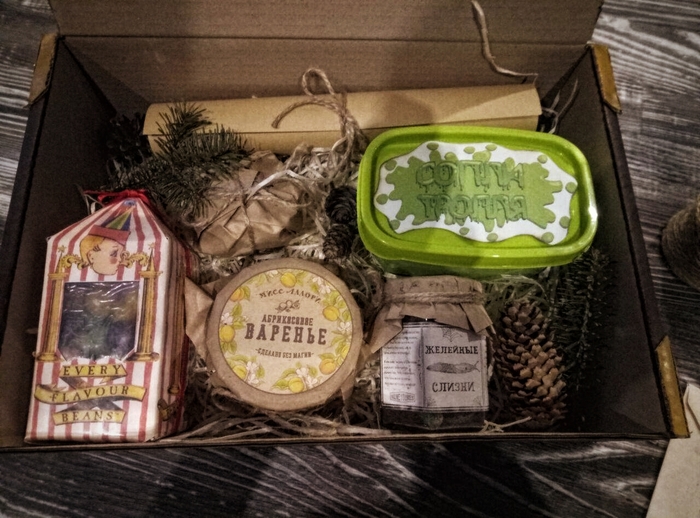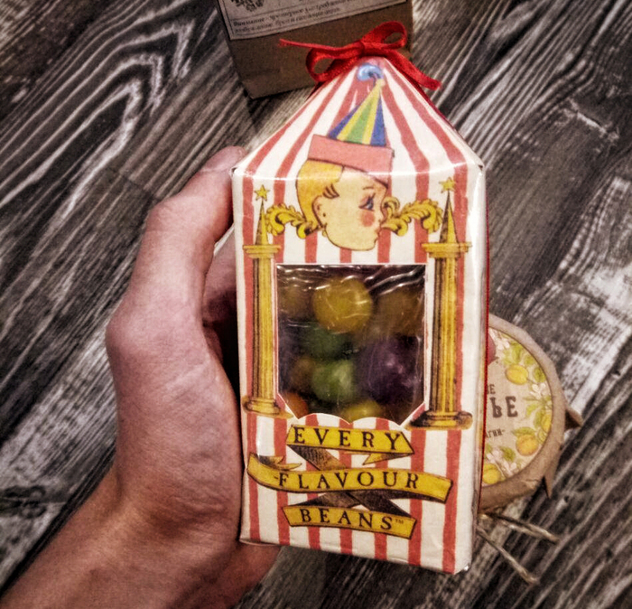 Драже Берти Боттс. Сначала я хотел наполнить упаковку из оригинальными драже с разными противными вкусами. Но узнав о их цене - я заменил их на обычные мармеладные драже (это кстати я правильно сделал, ибо у подруги оказался очень сильный рвотный рефлекс).