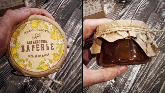 Абрикосовое варенье. Опять, я, использовав все свои дедуктивные методы - разузнал любимое варенье у виновника данного подарка) Действия точно такие же, только пришлось потратить немного времени, чтобы сделать действительно вкусное варенье. А дальше всё по стандарту: банка и этикетка в фотошопе. На сей раз этикетку лепил сверху крышки, в цвете. Пришлось применить все свои дизайнерские навыки)