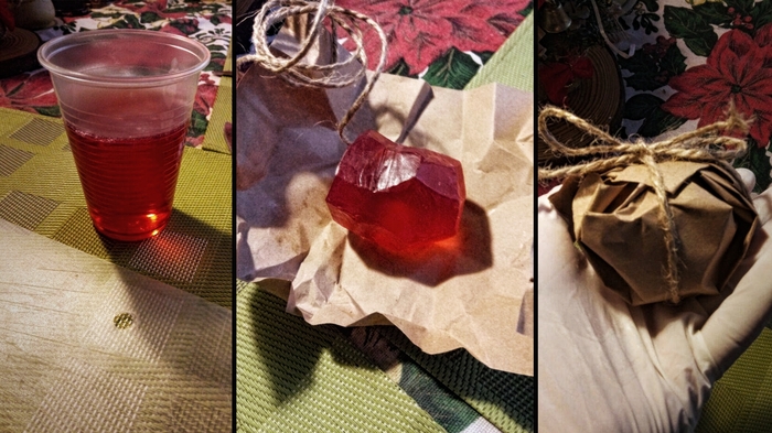 Еще с детства мне очень нравился Философский камень. И я решил, что хоть я тресну, но я его сделаю! Я конечно не Николас Фламель, но и философский камень у меня получился без трансмутации металлов в золото. Даже лучше! Им можно помыть руки!) Почитав пару статей, я купил основу для мыла, краситель и апельсиновую отдушку. Замесил всё это дело в одну кучу, залил в стакан и подождал пару часов, пока масса не застынет. Потом достал и постарался придать форму камня.