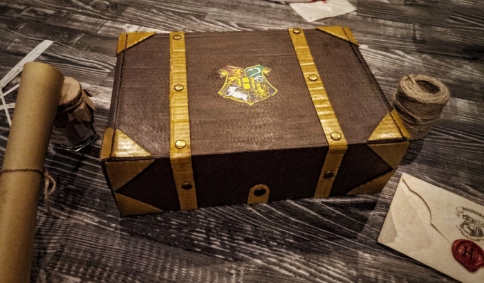Купив нужную коробку и лист картона, я сначала покрасил её в коричневый цвет, вырезал из картона отдельные детали, покрасил их в жёлтый цвет. Добавил немного хольнитенов и логотип Хогвартса. (И еще я криво покрыл её лаком). Вот что получилось в итоге: