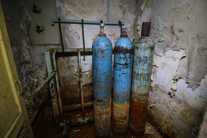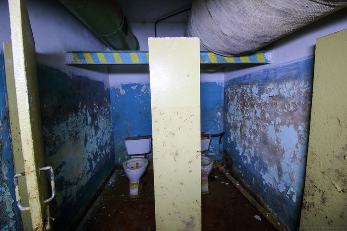 Еще одно помещение отведено под кислородную, для убежищ данного региона это распространенная практика. Возможно наличие такой комнаты обусловлено выпускаемой продукцией крупнейшего завода города. Ну и конечно главное помещение в любом убежище, вот что-что, а сортир есть везде. Только он тут очень низкий, интересно для кого его проектировали. Вот эта балка покрашенная, в предупреждающую полоску, как бы намекает, что можно об нее стукнуться. Вот только она мне была по грудь, а долбануться я пытался об зеленую трубу. Справа кстати весит резервуар с водой, именно его поддерживает балка.