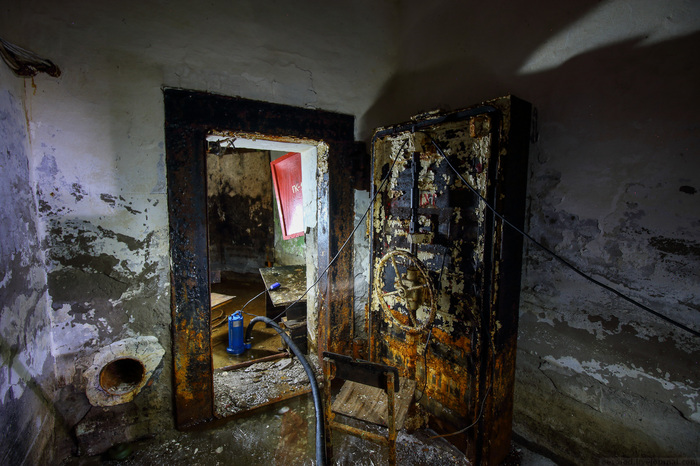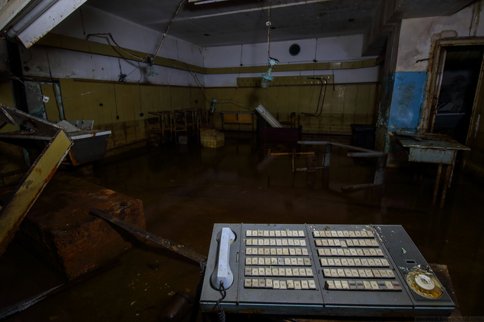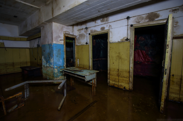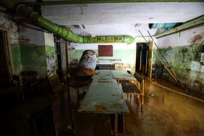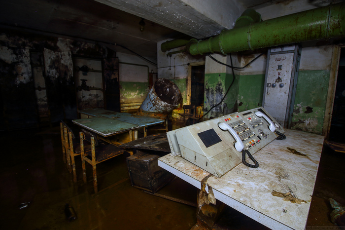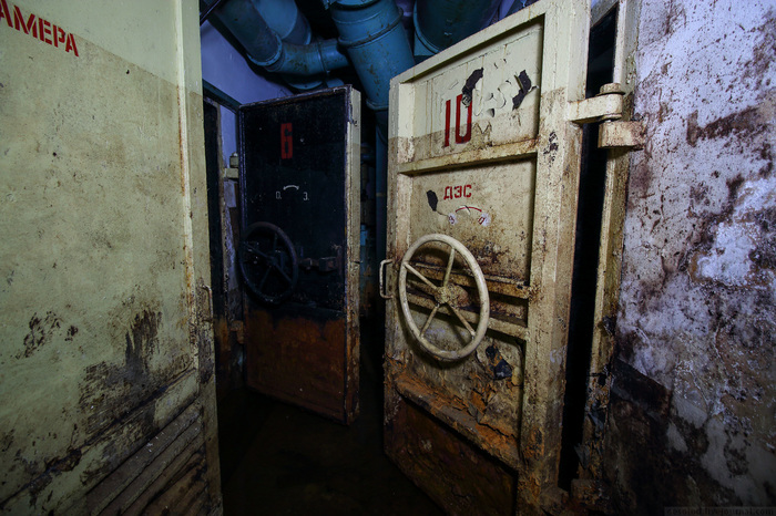 Стертые ступени уводят нас вниз. Почти сразу мы упираемся в гермодверь. Она открыта, но нижняя часть тонет в воде. Мы были готовы к этому, поэтому переодеваемся в сапоги и попадаем внутрь. Вокруг темнота, сырость и тишина. По убежищу разносятся волны и плеск воды, давно тут не было людей. Со временем глаза свыклись с темнотой, а мозг начал фильтровать звук воды. И тут вдруг через прибрежные звуки послышались голоса.