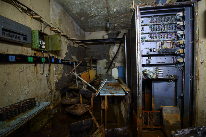 Но тут никто не мог находиться, в сырости и темноте. Мы по-прежнему не двигались с места. Вода совсем успокоилась, стало хорошо слышно, что источник звука находится в соседней комнате. Вслушавшись мы начали различать отдельные слова. «Пшш… миллион, миллион, алых роз…». Невозможно описать какое недоумение мы испытали в этот момент. Стало понятно, что источник звука не живой человек, а разговаривает радио. Мы сразу отправились смотреть. Оказалось, среди общего хаоса, внутри утопающего бомбоубежища, стоит обычное радио подключенное в розетку, и одиноко вещает эфир. (Можно увидеть его на трубе сверху). Успокоившись и поняв, что неожиданная встреча нам не угрожает, под ретро фм, мы отправились исследовать убежище. Бункер раньше был необходим для обеспечения связи в случаи ЧС.