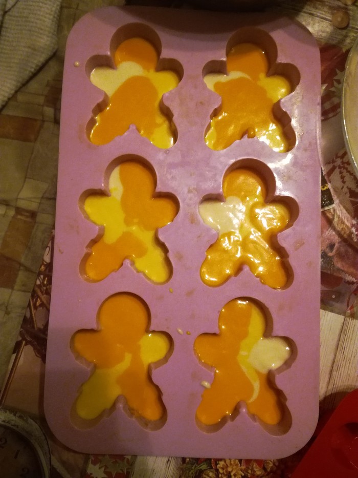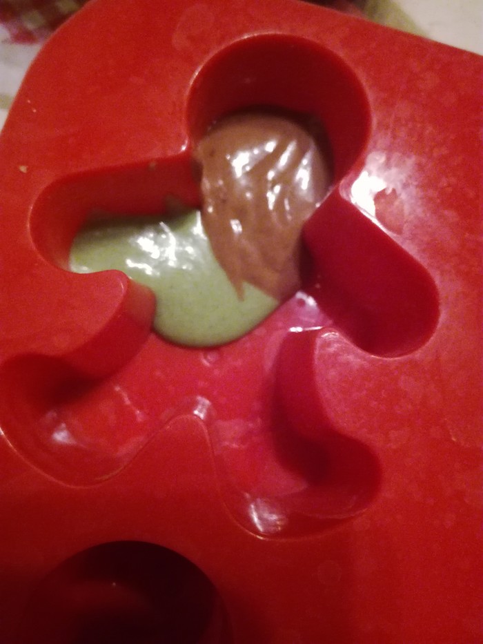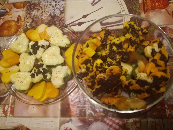 Формочки, как видите, в процессе выкладывания заляпываются только так. А вместе с ними заляпались стол, кот и мои сиськи (нет, фотопруфов не будет). Но это лирика и производственные издержки.