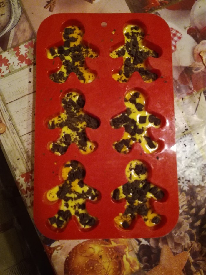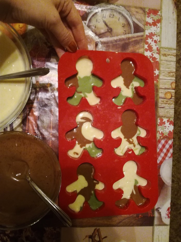 К песочной роте я ещё и шоколадку мелко порубленную добавила, потому что в предыдущий раз, когда пекла такие кексики (без камуфляжа), муж поржал, что это выглядит, будто в них дробью зарядили. Пришлось стрелять в спину бедным человечкам. Как говорит Джейме Ланнистер, "чего только ни сделаешь ради любви".