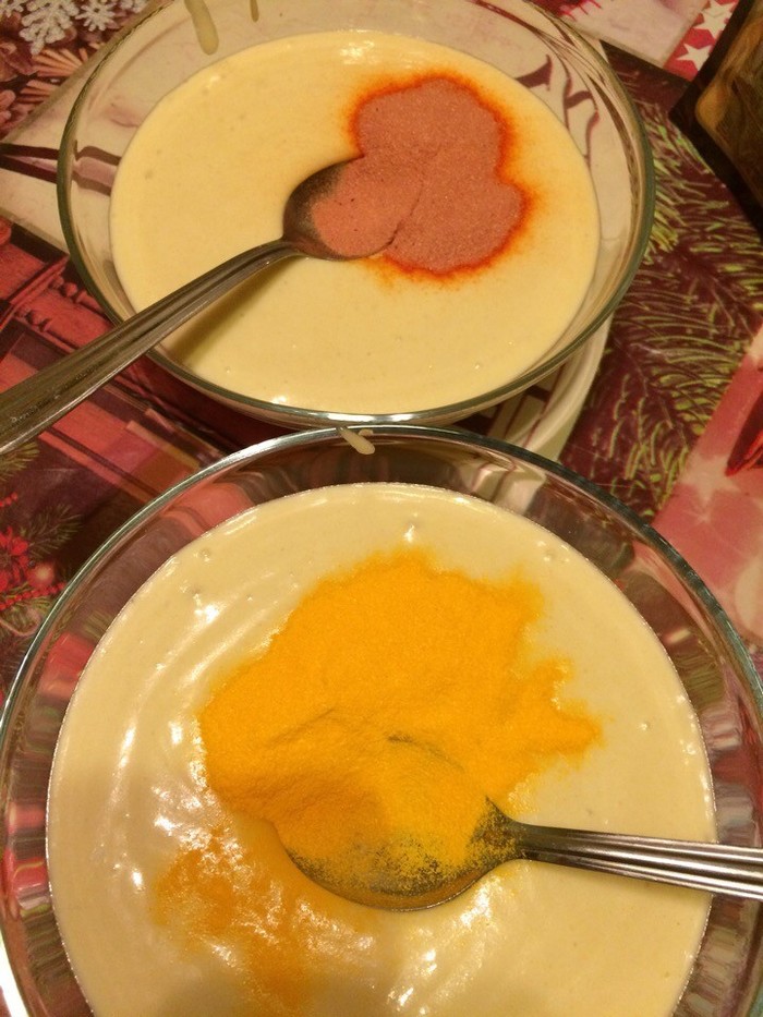 Далее берём формочки и по ложечке в произвольном порядке выкладываем цвета.