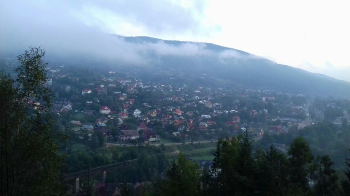 Путь к этой полянице нам был закрыт, но немного вернувшись назад, мы наткнулись на дорогу уже к другой полянице, которую мы, на этот раз, с успехом покорили. Вид был просто потрясающим. Горные хребты сплетались воедино и, словно под покрывалом, были укутаны дымкой, из под которой виднелись деревни.