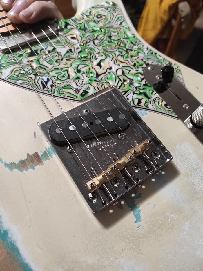 А вот и бережно и с любовью собранный кастомный телек. Очень хотелось мне этот классический инструмент, но смущала форма головы грифа, да и бридж на доступных скваерах современный с раздельными сëдлами.