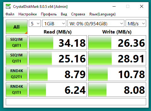 Ниже станет понятно, что диск заявленные скорости поддерживает, адаптер также работает верно.
