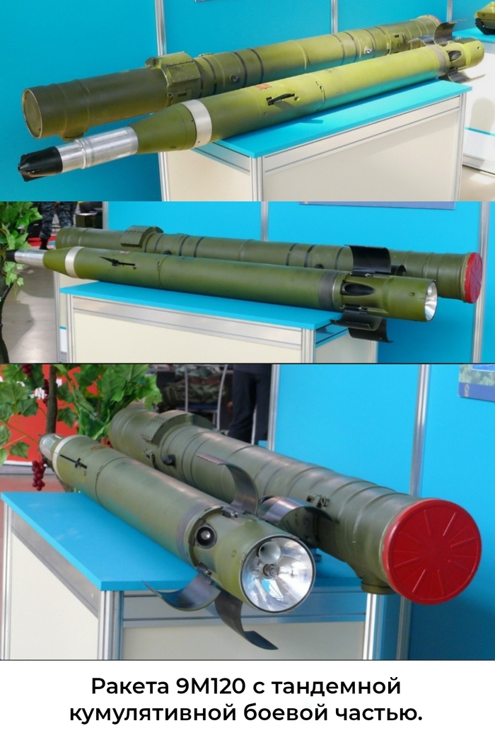 — ракета 9М120 (9М120М, 9М220) с тандемной кумулятивной боевой частью, преодолевающая динамическую защиту и далее танковую гомогенную броню (тандемная БЧ — выдвижная);