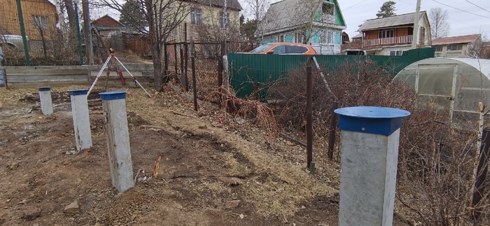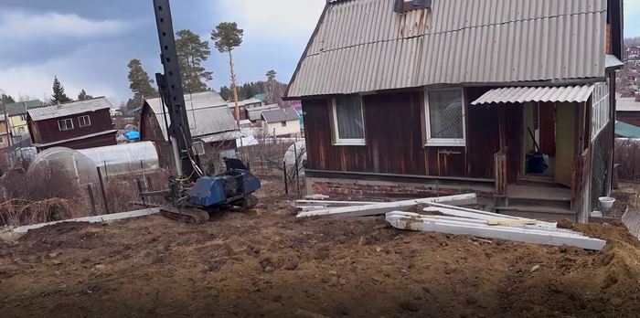 Участок здесь с большим уклоном. Поэтому при ленточном фундаменте пришлось бы выбирать много земли. А раскидывать ее негде, потому что на участке есть старый дачный домик.