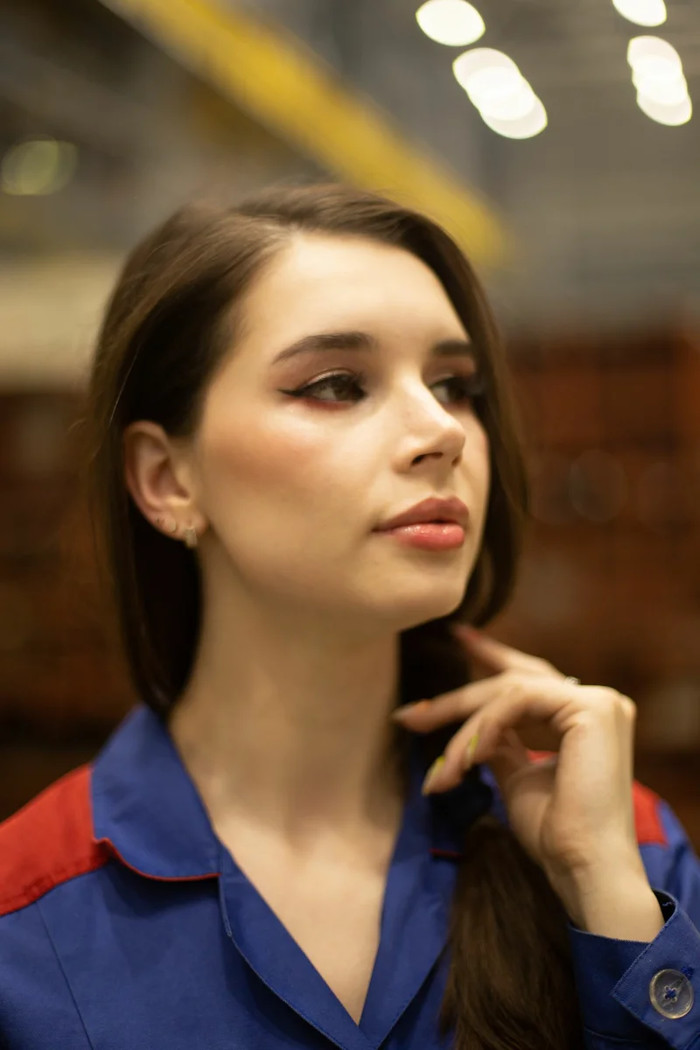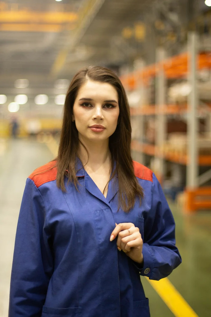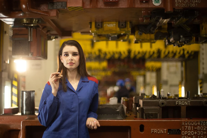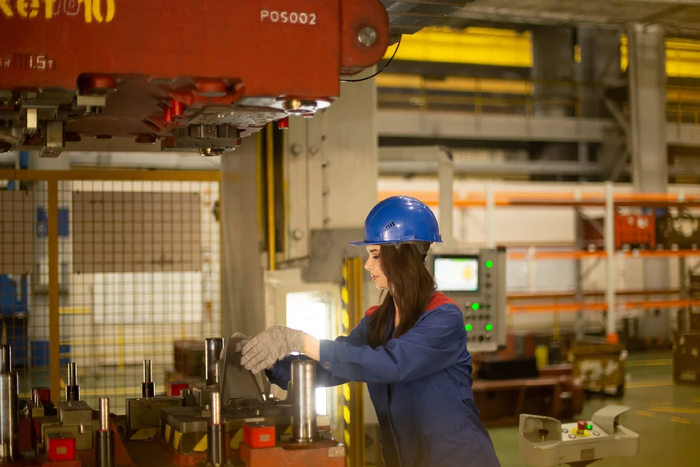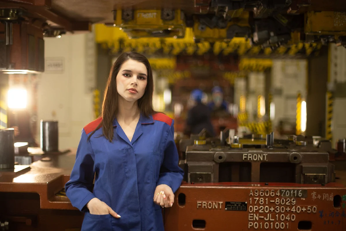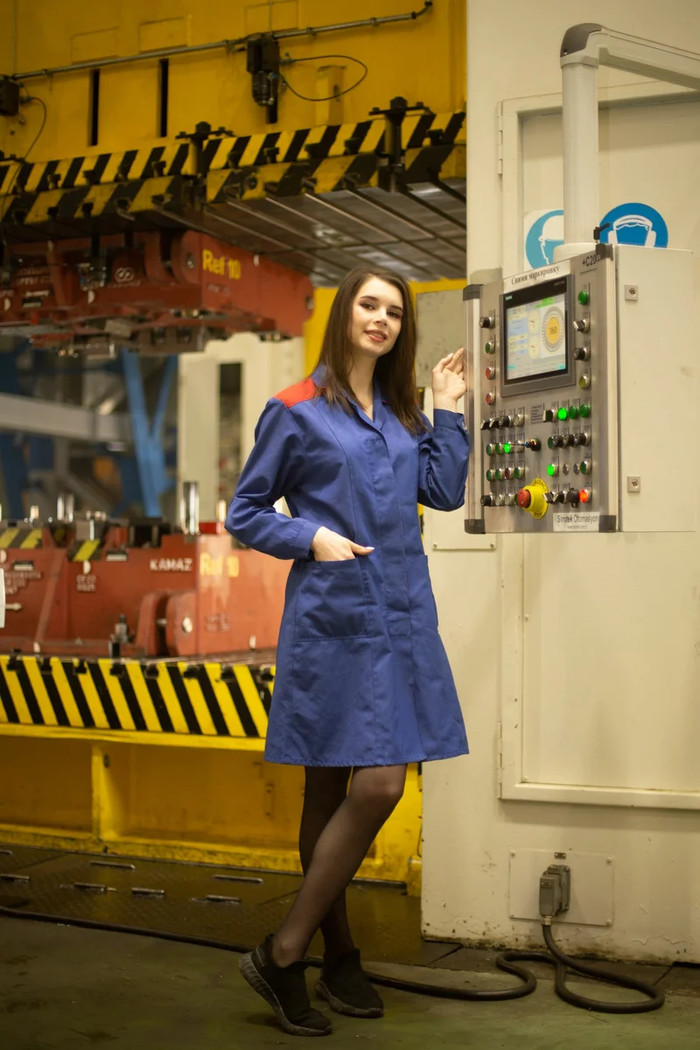Катя работает на прессе. Это серьёзная машина, которая путём давления на деталь в 501 тонну придаёт изделию необходимую форму. «Кладём деталь под пресс, одновременно с напарницей нажимаем кнопку старт, ждём обработки детали, вынимаем готовый продукт. В день получается около полутора-двух тысяч деталей».