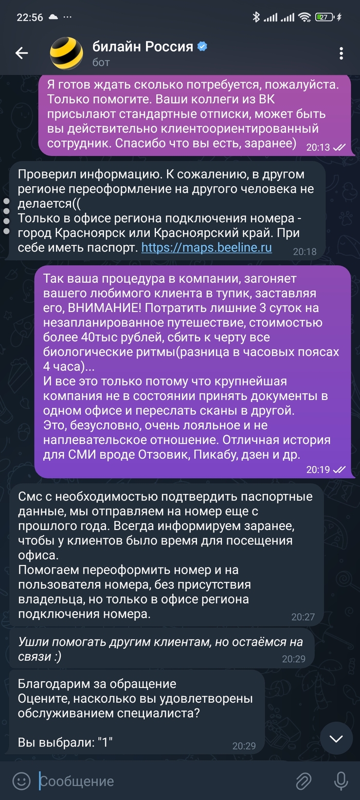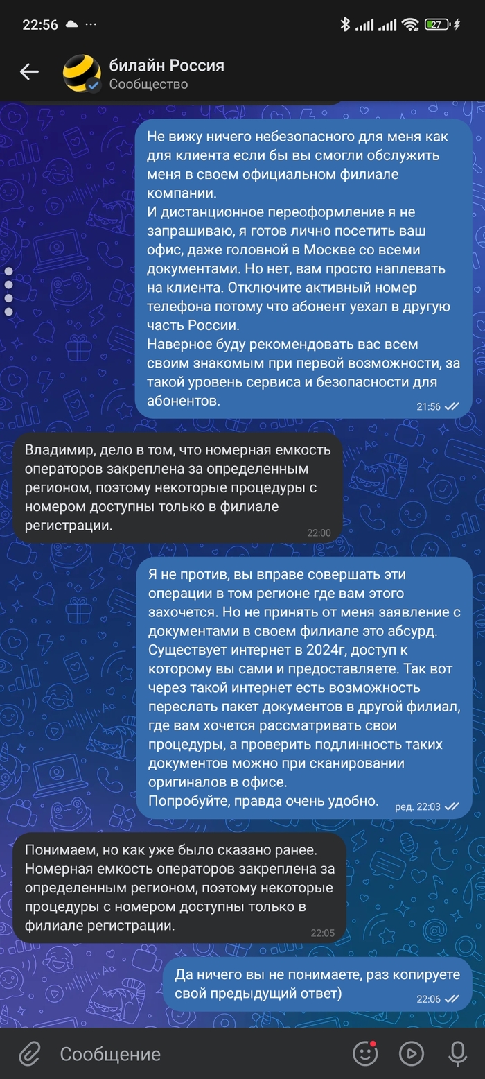 И вот спустя несколько посещений разных офисов Билайна по городу, десятков минут разговоров с операторами горячей линии - приходит понимание, что действительно мы в тупике и нужно ехать в другую часть света. Из последних сил пытаюсь гуглить, ищу посты на Пикабу и пишу в @beeline.Russia, по ссылкам на ТГ и ВК под одном из постов Пикабу.