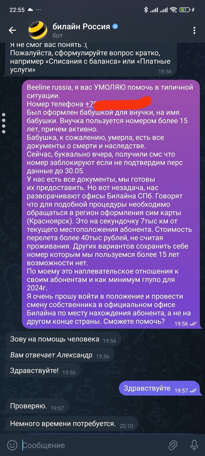 И вот, с тех пор, умничка внучка пользуется этой сим картой и номером телефона. И тут, внучка уже взрослая, возраста Христа, 33 года, давно переехала и живёт в г. Санкт-Петербург. Бабуля умерла. Спустя более 16 лет использования номера, вдруг, beeline начинает слать смски, о том что нужно подтвердить персональные данные. Мы, конечно, посетили офис Beeline, но оказалось что ничего сделать нельзя на месте, нужно обращаться с вопросом смены перс данных и данных о новом собственнике номера в г. Красноярск.(Напомню что сим зарегистрирована на бабулю)
