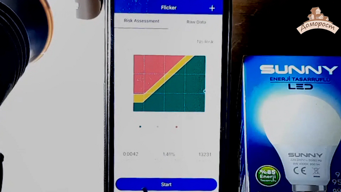 Теперь что с пульсациями света от этой лампы? Нет ли из-за них риска для нашего здоровья? Смотрим? Нет, никакого риска нет.