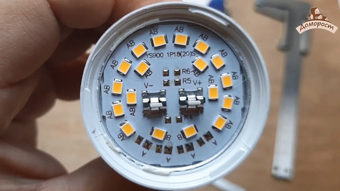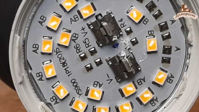 Маленький гвоздик прижимает центральный проводник 220 вольт. Резьбовая металлическая часть цоколя снята. И уже прекрасно виден драйвер лампы. Выпресовываю диодную плату вместе с драйвером из корпуса лампы.