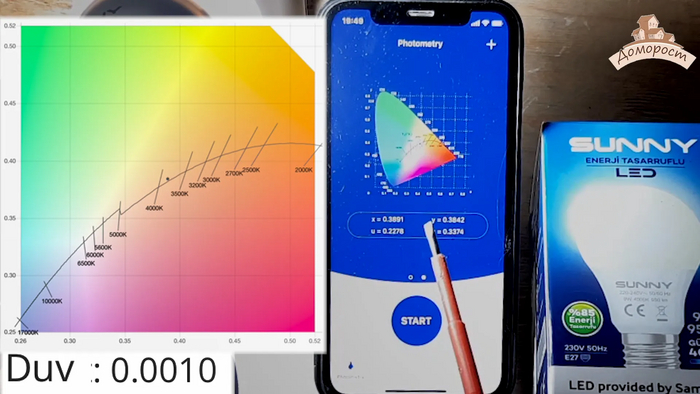 Цветовая температура 3837 Кельвина. Хороший индекс цветопередачи 83.1. Не зря Sunny хвастает на упаковке своими светодиодами. Хорошие светодиоды с хорошим качеством цветопередачи.