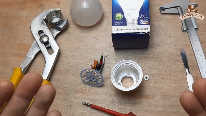 Разбираю лампу дальше. Здесь даже не надо избавляться от герметика, он никак не будет мешать снять диодную плату. Займусь цоколем. Здесь все как обычно.