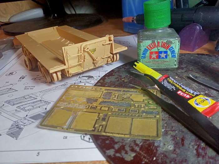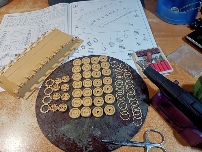 О создании: Сборка начинается с ходовой, и тут есть чем заняться. На каждый из 14 катков даны 2 ажурные накладные детали обода. Механическая обработка деталей маникюрным фрезером с алмазными и полировочными головками, алмазными пилками и скальпелем. Склеивал обычным и сверхтекучим модельным клеем.