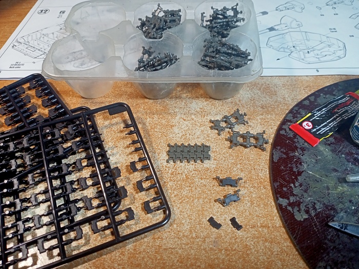 А вот и медитативный процесс на пару или больше вечеров - отделение, зачистка деталей гусеницы, её сборка и подгонка на катки, а затем вклейка резиновых накладок.