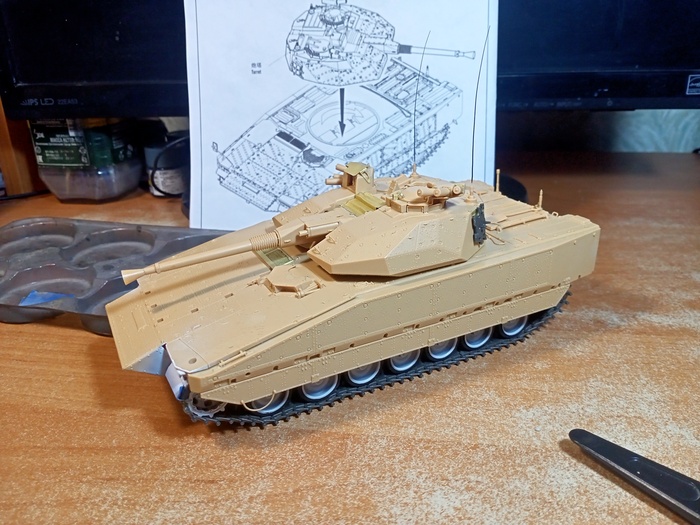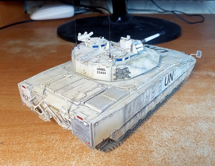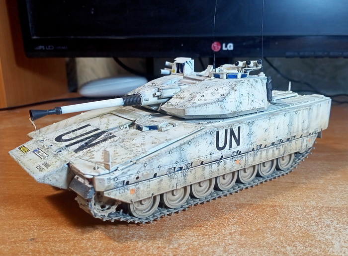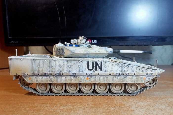 О наборе: набор 2012 года от китайской фирмы Hobby Boss в масштабе 1/35. В некрупной коробке лежит много чего: 11 литников из песочного полистирола, также из этого пластика отдельно отлиты ванна и верх корпуса, верхняя часть башни и ворнокообразный компенсатор орудия; 1 литник из прозрачного пластика; 4 литника из чёрного пластика с резиновыми подушками траков и 90 крохотных литничков из серо-стального полистирола с парой траков на каждом; пластинка фототравления, декаль, цветная схема окраски и реклама, чорно-белая инструкция. В наборе 585 деталей, 324 из них это элементы траков, не считая 52 травлёных деталей. Неиспользованными останутся 39 деталей, из них 4 травлёных. Качество литья великолепное - нет облоя, следы стыковки частей пресс-формы минимальны, никакой замыленности и прочих дефектов. Пластик хороший, несколько хрупковат на тонких деталях, что неудивительно. Детализация просто великолепна - от траков гусениц до дымовых мортирок всё проработано очень достойно и выглядит замечательно, особенно подкупает поверхность дополнительной брони, вся покрытая рядами заклёпочек, болтов и прочих мелочей. Модель не имеет интерьера, хотя все люки и десантную дверь можно выполнить открытыми. Стыкуемость стремится к идеальной, подгонки деталей не требуется. Фототравление очень качественное, включает довольно много деталей и хорошо повышает зрелищность модели. Есть с ним, правда, одна непонятная ситуация. Дополнительная броня на лбу корпуса, а также на боках и лбу башни имеет множество некрупных петель для закрепления всяких штук на броне - скаток, катков, вещмешков и т.д. На корпусе и левой половине башни эти элементы отлиты из пластика зацело с основной деталью, но на правой стороне башни они отсутствуют и их в количестве 7 штук дали травлёными элементами. Логики в этом я не увидел. Прозрачные детали чистые и аккуратные, но ими даны только фары и габаритные огни, перископы и прицелы даны из обычного пластика. У модели наборные гусеницы, при этом каждый трак состоит из двух деталей - основной серо-стальной и чёрной накладки. Из-за этого гусеницу теоретически можно не красить, ну и конечно ей можно придать любой провис или сделать перебитой. Это преимущества, а недостатки такой гусеницы в длительной, кропотливой и сложной сборке. Радует наличие 12 запасных траков - их можно повесить куда-то на броню, также никому не помешает страховка от потери/поломки пары траков. В коробке нет металлического троса, но стоковый пластиковый очень хорош и не требует замены. Набор не имеет вариативности по сборке, не считая возможности открыть люки, также нет бонусов. Инструкция - чёрно-белая книжечка с крупными и понятными схемами. Схемы окраски цветные, даны на отдельном глянцевом листе, машина показана с 5 проекций, что не сколько нужно для одноцветной окраски, сколько для позиционирования декалей. К сожалению, не указана принадлежность машин к части, местности и году, что в целом типично для Хобби Босса. Выбираем из двух вариантов: белая БМП контингента ООН в Либерии или машина шведской армии в монотонном зелёном окрасе. Интересно, что на белую машину ООН даны 4 варианта маркировки, отличающиеся, правда, только номерами. Декаль прекрасного качества, тонкая и яркая, прекрасно садиться на крайне неровную поверхность, имеет элементы технички, однако номера UNMIL несколько пе