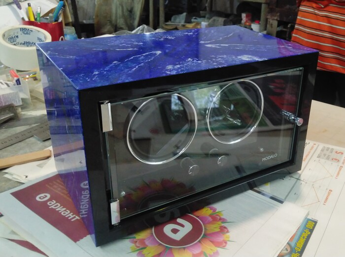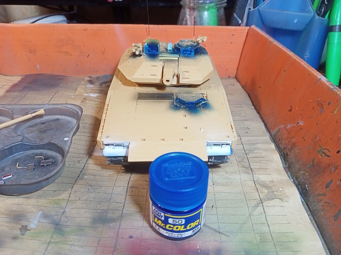 Для начала окрашиваем приборы наблюдения, прицелы и зеркала заднего вида. Чёрный глянец, серебро и прозрачный синий, затем бумажная маскировочная лента.